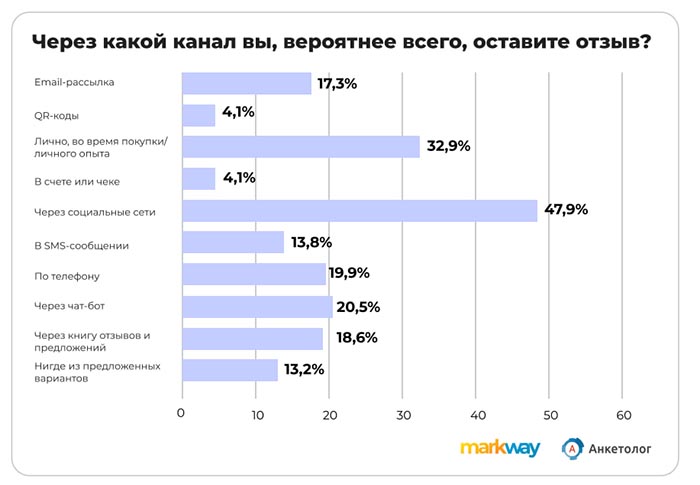 Треть клиентов оставляют отзывы не менее одного раза в месяц. Каждый десятый - несколько раз в неделю. Причем чаще это делают на маркетплейсах. Более 76% оставляют в интернете как положительные, так и негативные отзывы. Почти 15% респондентов вообще их не оставляют. Вероятнее всего покупатели оставят отзыв через соцсети (50%), QR-коды (33%) и чат-боты (20,5%).