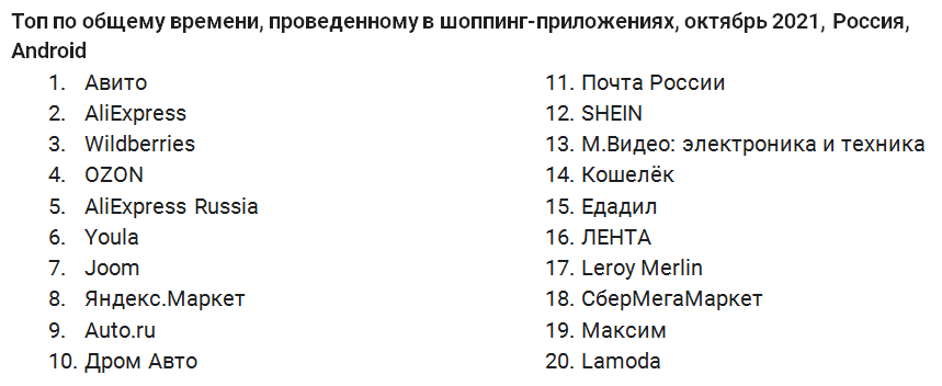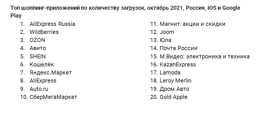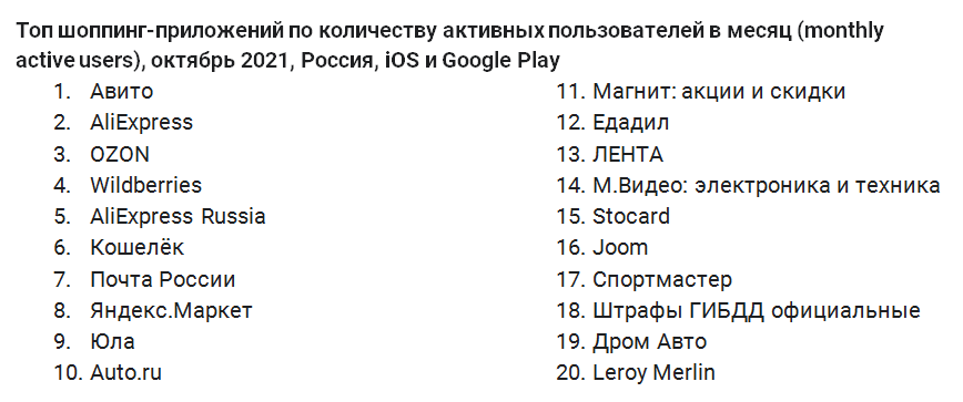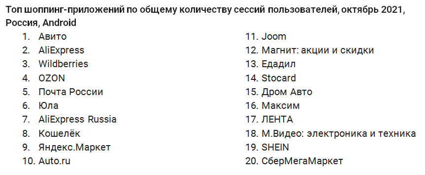 Платформа App Annie в преддверии черной пятницы опубликовала рейтинги шоппинг-приложений на российском рынке. В рейтингах представлены данные на конец октября 2021 года, и в них вошли не только классические маркетплейсы, но и приложения отдельных магазинов, доставок продуктов и другие приложения, так или иначе связанные с покупками.