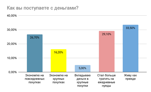 По результатам опроса выяснилось, что 26,7% жителей нашей страны сейчас вынуждены экономить на повседневных покупках, 16,2% ограничивают себя в крупных покупках, и только 5% тратят по-крупному. При этом расходы на повседневные нужды заметно выросли - об этом сообщают 29,1% респондентов.