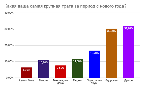 Существенно больше россиян в последнее время тратили деньги на собственное здоровье – 30,3% назвали самыми крупными тратами расходы на медицинские услуги. 31,9% опрошенных назвали другие глобальные покупки, среди которых были недвижимость, туристические путевки, ювелирные украшения, отдых и развлечения и т.д.