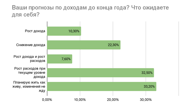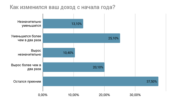 А что с доходами? О том, что их заработок с начала года уменьшился, сообщили 38,2% опрошенных, при этом у 25,1% он снизился больше, чем вдвое. 37,5% россиян не заметили изменений, а вот трети респондентов (30,5%) повезло больше - у них доходы выросли, причем у 20,1% из них - более чем в два раза.