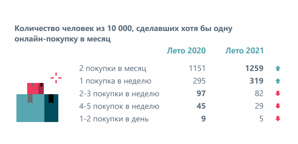 На 10 000 онлайн-покупателей, каждый из которых оплатил хотя бы один заказ в месяц, летом 2021 года пришлось 1259 человек, сделавших 2 покупки в месяц, 319 человек - 1 покупку в неделю, 82 - 2-3 покупки в неделю, 29 - 4-5 покупок в неделю и 5 человек, покупавших раз в день и чаще.