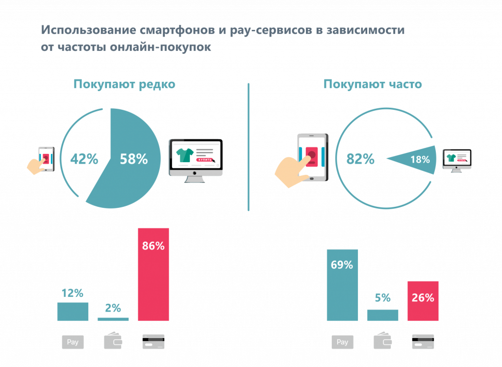 Существует прямая зависимость между тем, как часто человек делает онлайн-покупки, и тем, какими устройствами и платежными средствами он при этом пользуется.