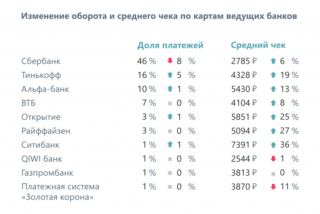Из десятки ведущих российских банков следует выделить Тинькофф, Альфа-банк, Открытие и Ситибанк, по картам которых этим летом вырос денежный оборот при совершении онлайн-платежей. Активнее всего росло число платежей по картам Тинькофф - с 11% до 16% год к году.