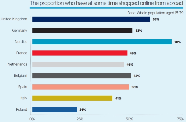 Также исследование показало, что кросс-бордерная торговля становится популярнее. С 2013 года число европейцев, хотя бы раз совершивших покупку в зарубежном интернет-магазине, возросло на почти 11 млн. Такой вид шоппинга наиболее популярен в Скандинавии (70%), которая опережает Великобританию (58%) и Германию (53%).