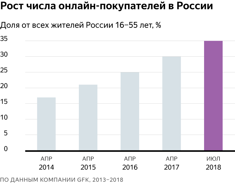 35% россиян хотя бы раз за последние полгода покупали товары в интернете. Этот показатель резко растёт. С весны прошлого года постоянных онлайн-покупателей стало больше на 17%. Это следует из данных исследования "Яндекс.Маркета" и компании GfK о развитии рынка интернет-торговли в России.