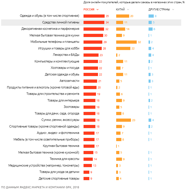 Список самых популярных категорий товаров, которые наши сограждане заказывают в интернете, не меняется. В российских онлайн-магазинах чаще всего россиян интересуют одежда и обувь, мелкая бытовая техника и косметика, в Китае - смартфоны, сумки и ремни, игрушки.
