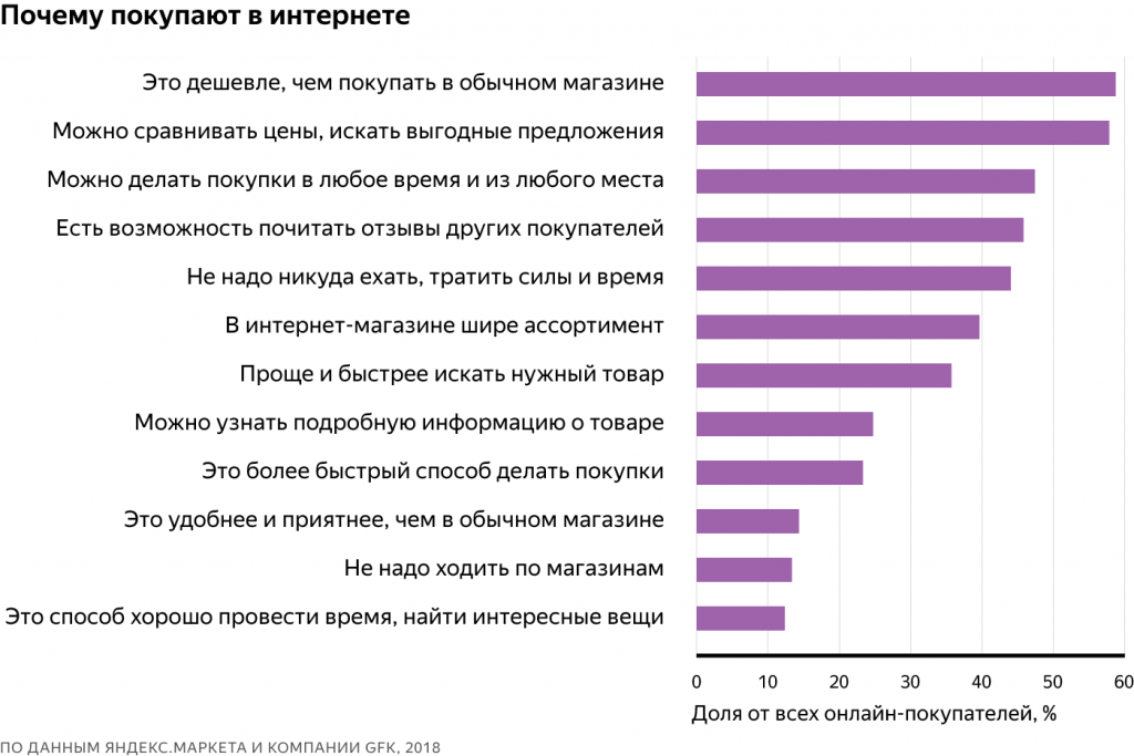 Интернет-магазины выбирают те россияне, которые желают сэкономить. Больше половины опрошенных заявили, что покупают онлайн из-за более низкой, чем в обычных магазинах, стоимости товаров. Людей привлекает также возможность сравнивать цены, искать выгодные предложения и делать покупки в любое время и в любом месте.