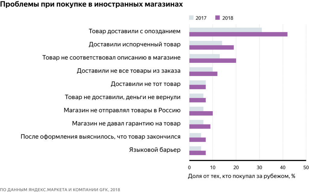 Интересно, что доля людей, столкнувшихся с реальными проблемами при покупке на зарубежных площадках, по сравнению с 2017 годом сократилась. Сильнее всего потеряли в актуальности как раз те проблемы, которые связаны с доставкой и несоответствием товара описанию на сайте.