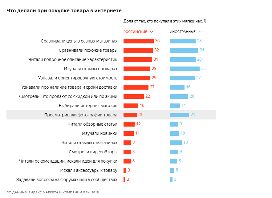 Эксперты сравнили поведенческие паттерны пользователей в разных интернет-магазинах и поняли, что при покупке в России наши сограждане чаще сравнивают стоимость на разных сайтах и узнают условия доставки. При покупке за рубежом - читают отзывы и рассматривают фотографии товаров.