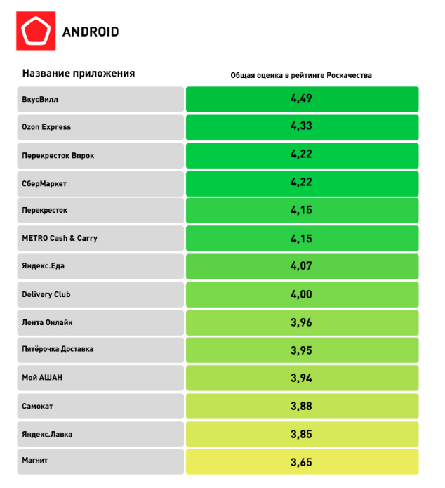 Лучшими по совокупности всех критериев признаны приложения "ВкусВилл", Ozon, "Перекресток" и "Сбер" для Android, а также "ВкусВилл", Ozon и "Перекресток" для iOS.