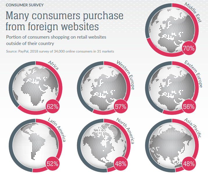 Уже больше 50% онлайн-покупателей на Ближнем Востоке, в Африке, Европе и Латинской Америке выбирают товары на иностранных сайтах, следует из опроса PayPal.