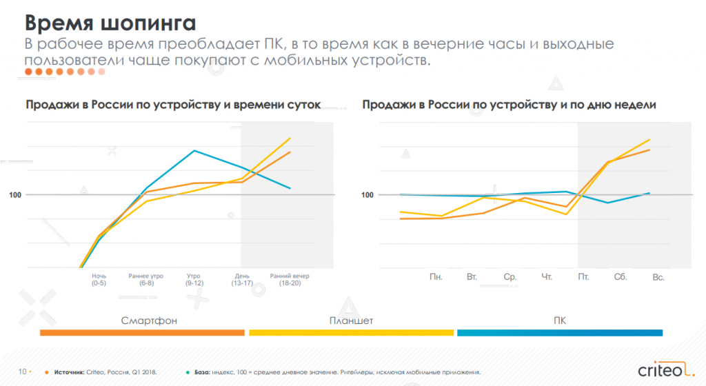 ● Потребители предпочитают совершать покупки с мобильных устройств в вечернее время и по выходным, однако настольные ПК остаются предпочтительным инструментом для осуществления покупок в первой половине дня в будни.