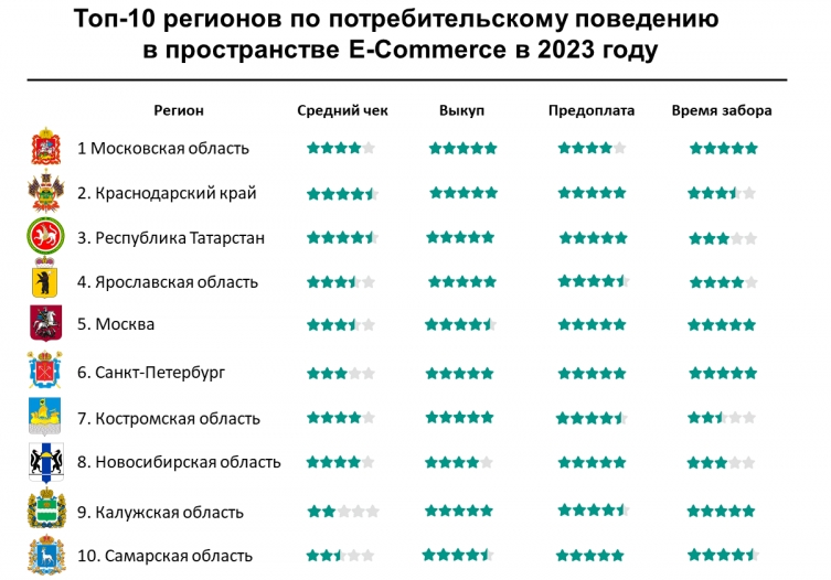 Московская область смогла занять первое место благодаря высокому выкупу и быстрому забору заказов. В 2023 году в большинстве регионов отмечено значительное увеличение среднего чека, рост выкупа и доли предоплаченных заказов, а также сокращение времени забора заказов. Причиной этому стали как объективные факторы (инфляция, увеличение плотности ПВЗ и постаматов), так и изменения в потребительском поведении россиян.