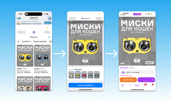 ● Покупка через Wildberries. Когда клиент нажимает кнопку "Купить" в Telegram-витрине, то автоматически попадает на страницу этого товара на Wildberries. Оплата и доставка происходят на стороне маркетплейса. То есть вы не нарушаете правил платформы и продолжаете продавать внутри маркетплейса, просто привлекаете аудиторию через другой канал.