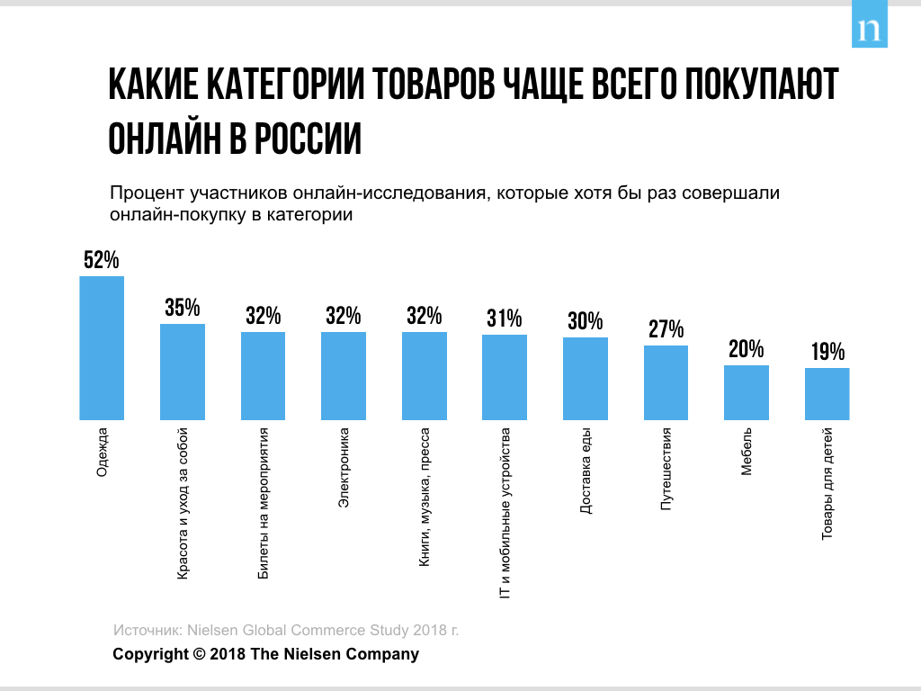Россияне стали больше доверять онлайн-шоппингу, список покупаемых ими в интернете товаров расширился, показало исследование компании Nielsen. 90% респондентов совершили по меньшей мере одну покупку в интернете когда-либо в течение последних лет.