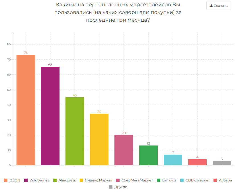 92% участников опроса компании "Анкетолог" (всего опрошено 1900 россиян старше 18 лет) хотя бы раз покупали товары на маркетплейсах за последние три месяца. Среди них 73% приобретали товары на OZON, 65% - на Wildberries, 45% - на AliExpress, треть (34%) - в "Яндекс.Маркете". Меньшей популярностью пользуются такие площадки, как "СберМегаМаркет" (20%), Lamoda (13%), "CDEK.Маркет" (7%), Alibaba (4%) и прочие.