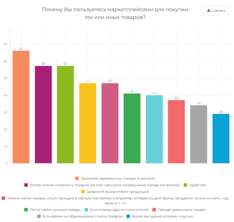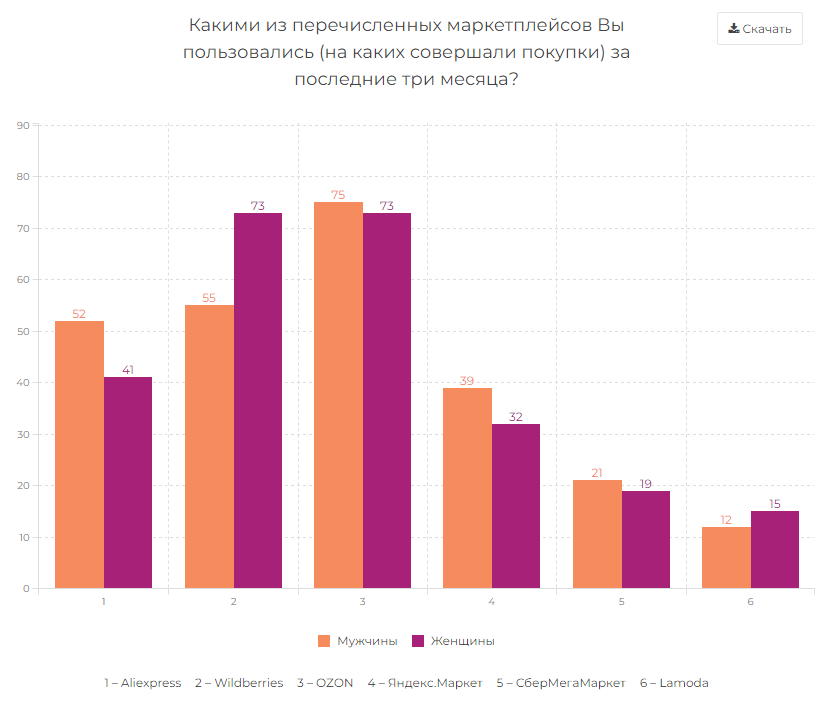 Согласно исследованию, мужчины чаще покупают товары на AliExpress (52% против 41% женщин) и в "Яндекс.Маркете" (39% против 32% соответственно). Женщины же больше мужчин предпочитают Wildberries (73% против 55% соответственно) и Lamoda (15% против 12%). Также исследование показало, что респонденты с более высоким доходом и жители городов-миллионеров чаще заказывают товары на Lamoda и в "СберМегаМаркете".