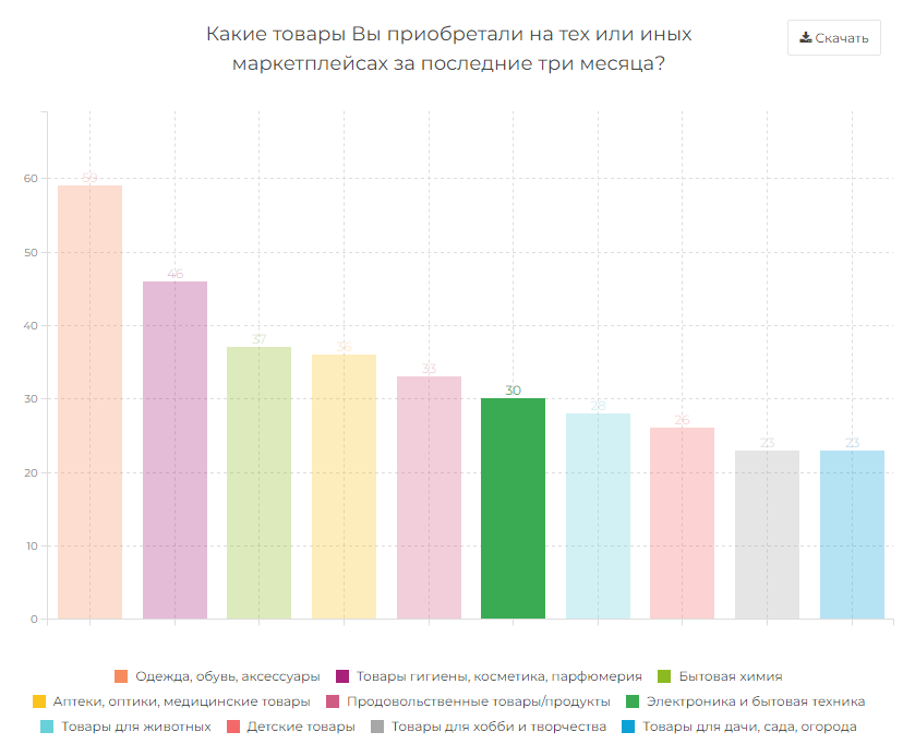 Наибольшим спросом на маркетплейсах пользуются одежда, обувь и аксессуары - товары этой категории за последние три месяца покупали 59% потребителей. Также 46% приобретали косметику и парфюмерию, 37% - бытовую химию, 36% - медицинские товары, 33% - продукты питания, а 30% - электронику и бытовую технику.