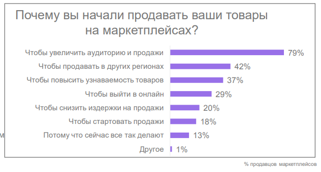 Около 80% продавцов вышли на маркетплейсы, чтобы увеличить аудиторию и продажи, 42% - ради масштабирования продаж и ради экспансии в другие регионы, 37% - чтобы повысить узнаваемость товаров. Каждый третий продавец (29%) использовал маркетплейсы, чтобы впервые начать продавать через интернет, а каждый пятый (20%) - чтобы снизить издержки на продажи.