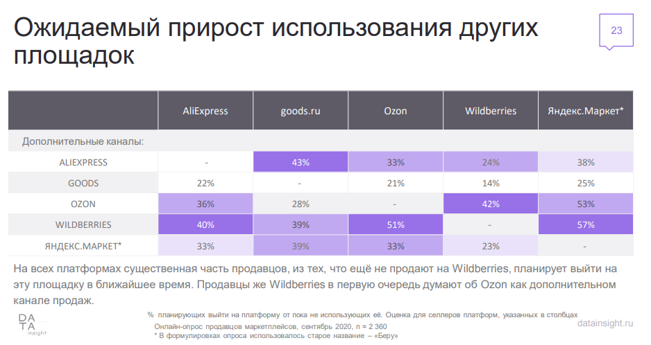 На всех платформах существенная часть продавцов, из тех, что ещё не продают на Wildberries, планирует выйти на эту площадку в ближайшее время. Продавцы же Wildberries в первую очередь думают об Ozon как дополнительном канале продаж.