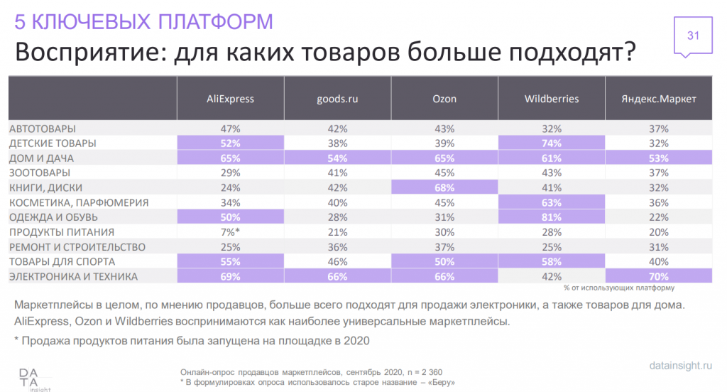 ● Электроника и техника: Яндекс.Маркет (70%), AliExpress (69%), goods.ru (66%), Ozon (66%)