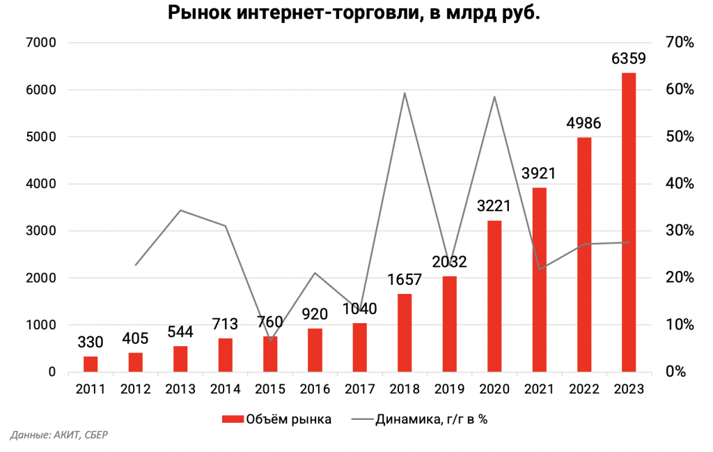 Объем интернет-торговли в России в 2023 году составил почти 6,4 трлн рублей (6 358 959 млн руб.), рост по сравнению с предыдущим годом 28%. Большая часть из этой суммы 96,9% составляет покупки на внутреннем рынке, у российских компаний интернет-торговли - 6,2 трлн рублей, на трансграничный рынок приходится 3,1% объема (197млрд рублей).