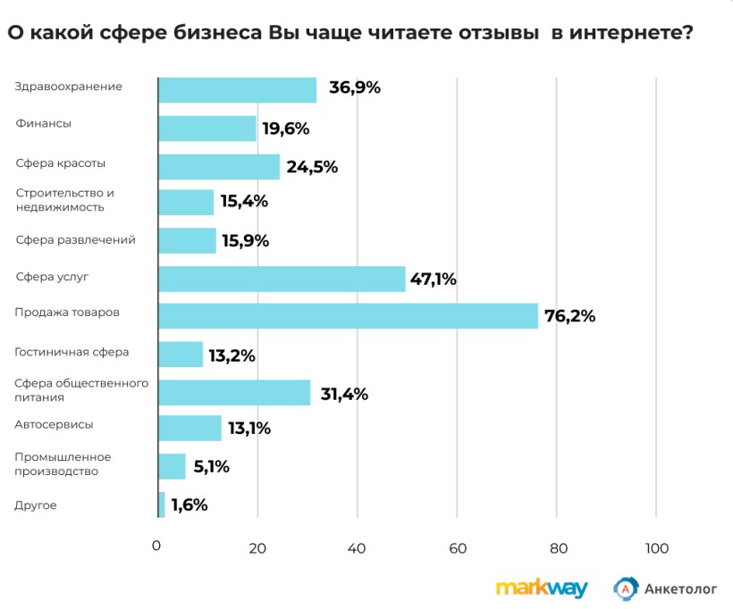 Перед покупкой товаров в онлайн-магазине читают отзывы 76% респондентов. Также их часто проглядывают пользователи сферы услуг (почти 50%).