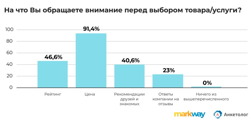Цена остается важным фактором при выборе товара или услуги. В 2024 году доля тех, кто обращает внимание на стоимость, выросла на 5,6% и достигла 91,4%. Также россияне активно изучают рейтинги товаров (46,6%) и доверяют рекомендациям знакомых (40,6%).