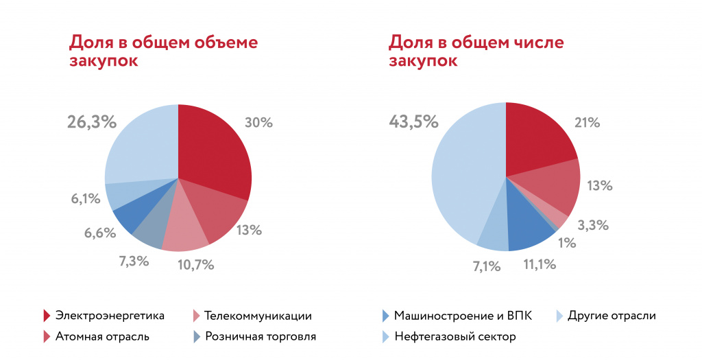 Переход на электронные закупки крупных розничных сетей вывел этот сегмент на 4 место: 7,3% объема и 1% числа торгов. В результате ритейл опередил металлургические, нефтегазовые и машиностроительные предприятия по объему электронных закупок. Значительный рост также продемонстрировали предприятия строительной отрасли, сельского хозяйства и пищевой промышленности.