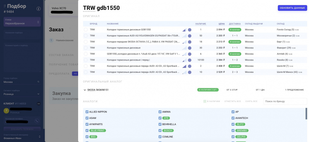 У дистрибьюторов иногда есть свои базы данных, которые позволяют узнать всё, что нужно, из номера. Есть сторонние программы, например, новосибирская Laximo. Она предоставляет такой каталог как услугу. К ней можно интегрироваться, встроить в систему. Это существенно сокращает время работы подборщика, уменьшает шанс, что будет ошибка или клиент "соскочит" во время звонка.