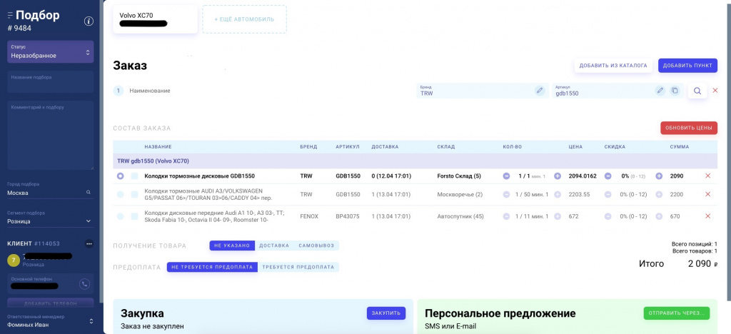 После этого менеджер создаёт карточку "подбор товара". Это второй этап формирования заказа. В эту карточку можно выбрать автомобиль заказчика или подбирать детали без конкретного автомобиля (это нужно, если в роли заказчика выступает сервис или если заказывается какой-нибудь расходник, типа автомобильного масла). В карточку вводятся необходимые артикулы.