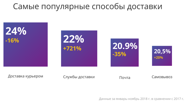 За год спрос на услуги доставки вырос в восемь раз: в 2017-м на них приходилось 3% заказов, в 2018-м – уже 22%.