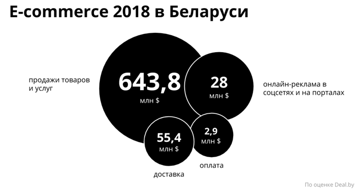 Так, по оценке Deal.by, товарооборот товаров и услуг, купленных онлайн в 2018-м году, составил $643,8 млн. Выручка от их рекламы в соцсетях, на онлайн-ресурсах и маркетплейсах – $28 млн. На онлайн-оплатах операторы заработали $2,9 млн, на доставке товаров, купленных в интернете – $55,4 млн.