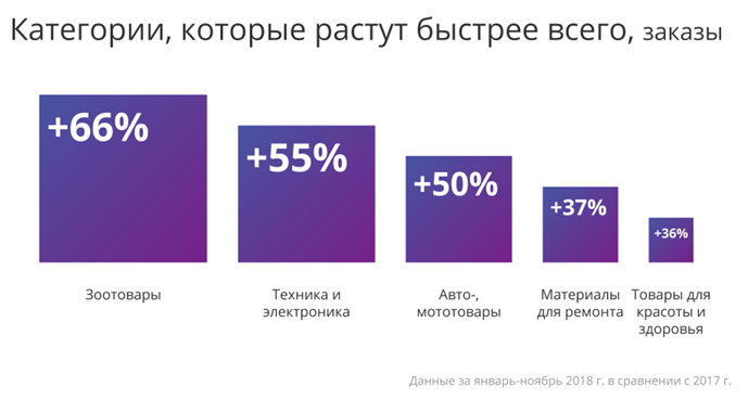 Чаще всего в 2018 году покупали товары для дома и сада, технику и электронику, товары для детей, товары для красоты и здоровья и авто-, мототовары. Сильнее всего вырос спрос на зоотовары, технику и электронику, авто-, мототовары, материалы для ремонта и товары для красоты и здоровья.