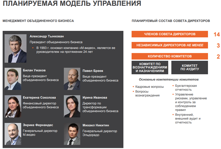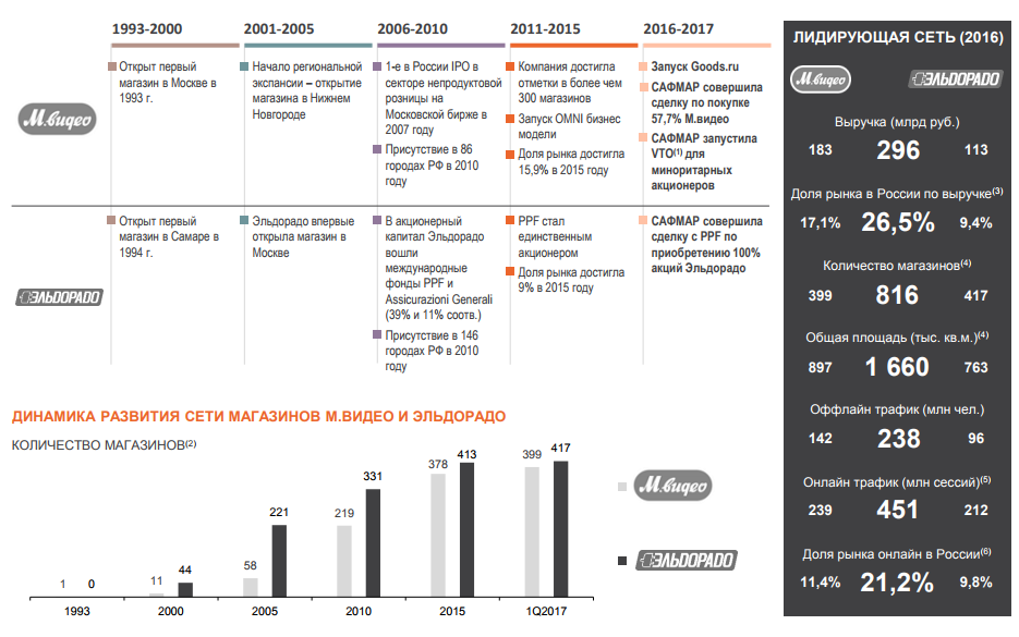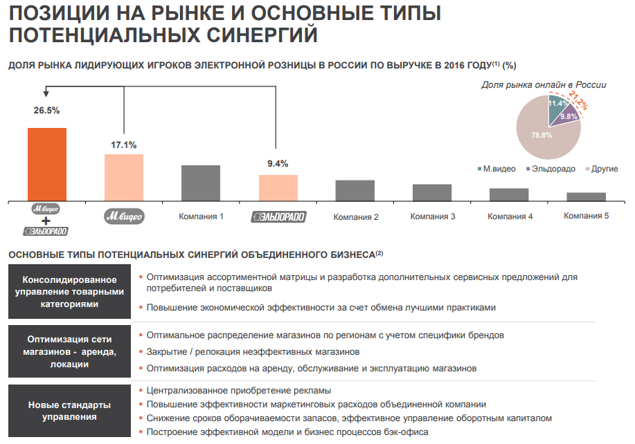 Группа "Сафмар" представила инвесторам видение потенциала и перспектив компании после возможного объединения бизнеса ПАО "М.видео" и ООО "Эльдорадо". В компании предполагают, что объединенный ритейлер по выручке займет долю в 26,5% всего российского рынка или суммарно 21,2% от онлайн-рынка в России. Такой расчет был получен сложением финансовых результатов "М.Видео" и "Эльдорадо".