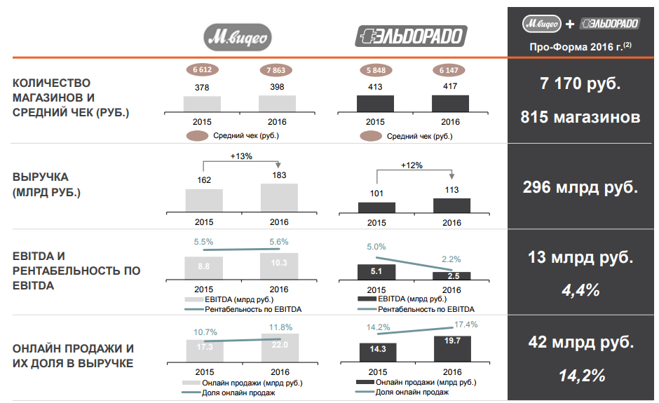 Если бы компания объединила все свои торговые точки 31 марта 2017 года, количество ее магазинов достигало бы 816. Объединенная компания суммарно получила бы 296 млрд рублей выручки. Средний чек в объединенной компании составит 7 170 рублей.