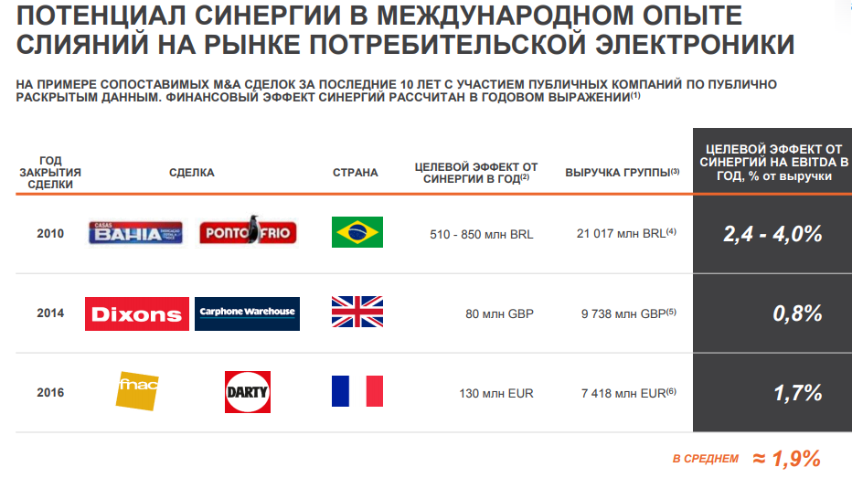 В качестве основных потенциальных синергий "Сафмар" указывает оптимизацию ассортиментной матрицы и разработку дополнительных сервисных предложений для потребителей и поставщиков. Объединение ритейлеров приведет к повышению экономической эффективности за счет обмена лучшими практиками, оптимальное распределение магазинов по регионам с учетом специфики брендов.