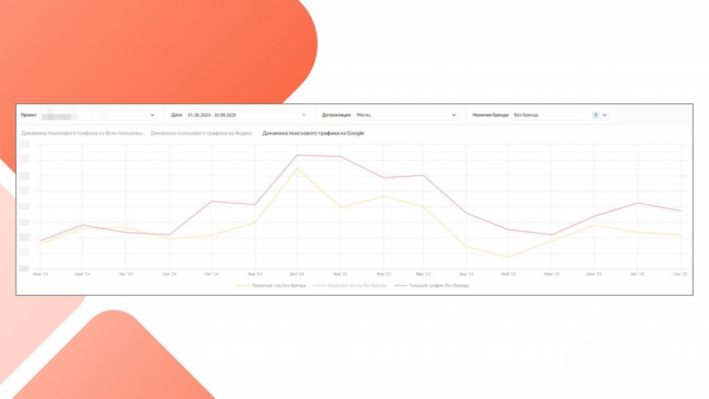 Итогом нашей работы стал рост небрендового трафика из поиска Google на 25% по сравнению с предыдущим годом. Это главное достижение.