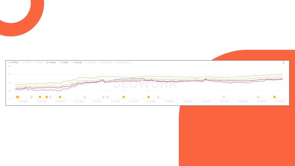 При этом мы не просто остановили падение — мы обеспечили мощный рост видимости по целевым запросам, обогнав динамику рынка. Аналитика Google показала: нам удалось развернуть негативный тренд и продемонстрировать рост, кратно превышающий среднерыночные показатели.