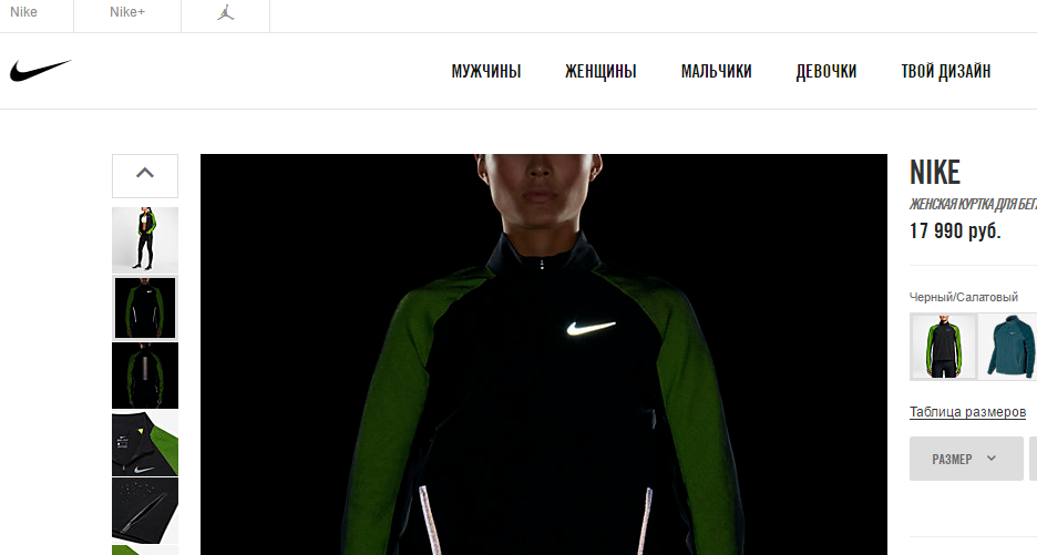 Интересно, что некоторые сайты, желая показать клиенту, как их товар будет вести себя в различных условиях, используют необычные ракурсы и виды съемки. Например, сайт спортивной одежды Nike делает фотографии женских курток для бега в ночном свете, чтобы показать, как человек будет выглядеть во время вечерней пробежки в свете фар.
