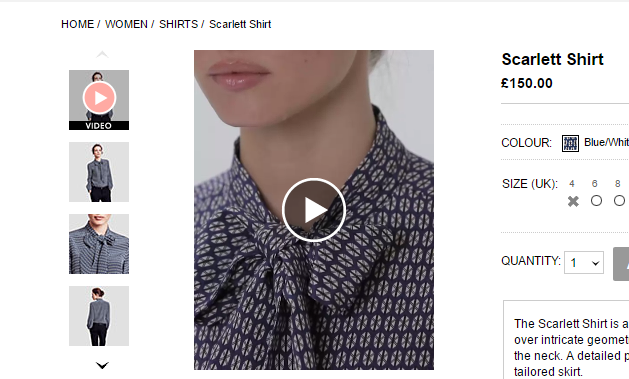 Еще один способ демонстрировать особенности ткани или отдельных элементов одежды - подробное видео. Британский интернет-магазин Thomas Pink выкладывает в карточках товара видео, на котором камера бежит вдоль одежды так, что видны её мелкие детали.