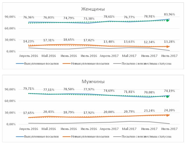 Цифры показывают нам любопытные закономерности. В ретроспективе последних 2 лет процент выкупа у дам стабильно увеличивается, в то время как у джентльменов заметно падает. И если в 2016 году это падение было медленным, то в 2017 оно уже становится тревожным.