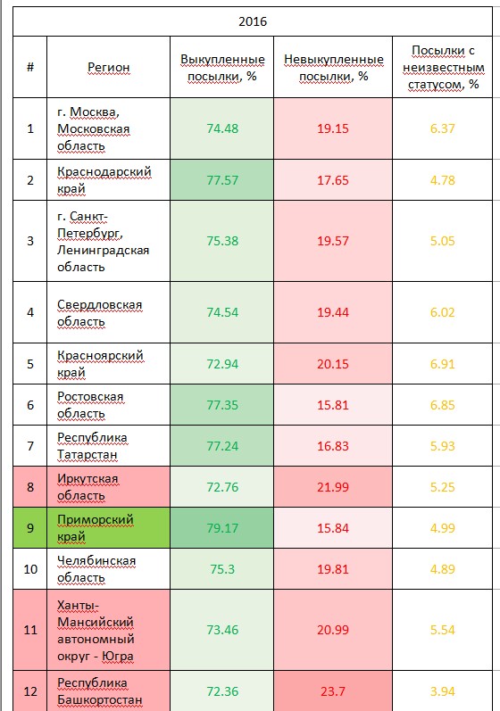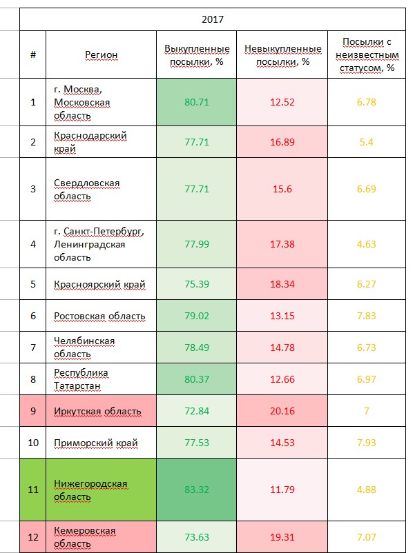 А сейчас взглянем на статистику по регионам. Ниже представлены списки субъектов, лидирующих по количеству посылок из интернет-магазинов (топ-30) в 2016 и 2017 годах. Зеленым выделены названия 5 регионов с максимальной долей выкупа. Красным - те области и республики, где зафиксировано наибольшее число невостребованных (вернувшихся продавцу) отправлений.