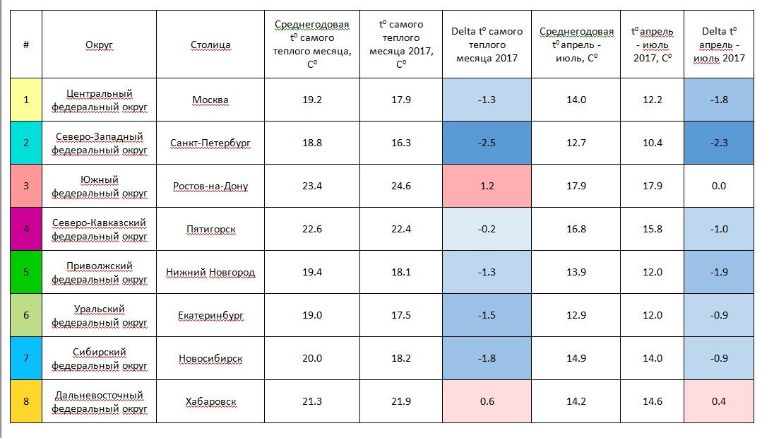 Шутка о том, что лето в России короткое и малоснежное, давно обросла бородой. Однако, в этом году она вдруг стала актуальной как никогда. Только взгляните: средняя температура воздуха в 2017 году была ниже обычной (вычисленной по многолетним наблюдениям) практически на всей территории РФ (данные http://weatherarchive.ru).